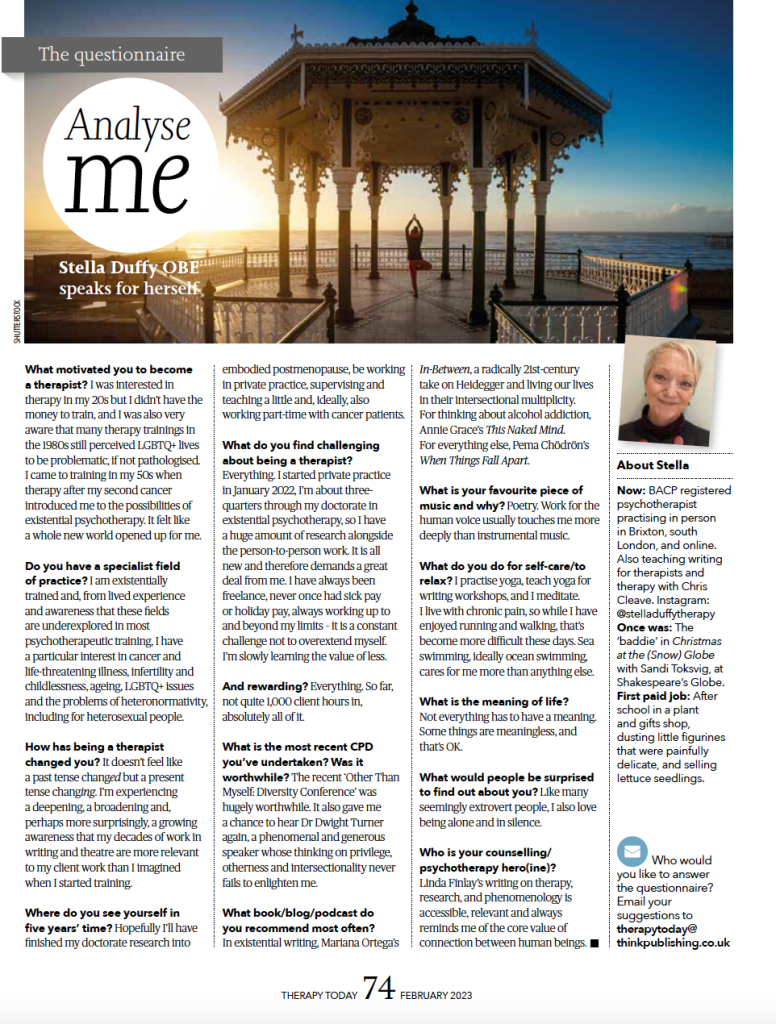 BACP’s magazine has a section called Analyse Me, where therapists talk about their own inspirations and interests. Here’s a PDF with my interview on yoga, writing, meaning, meaninglessness, good books, and what I did before I was a therapist.